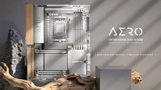 GIGABYTE AERO X3D WOODを詳解。X870EとAM5でRyzen 9000/8000/7000に対応し、DDR5高OC、PCIe 5.0 x16、M.2×4、Wi‑Fi 7、USB4、5GbE×2を搭載。X3D Turbo Mode 2.0でゲーム性能最大25%向上も。木目調デザインも魅力。