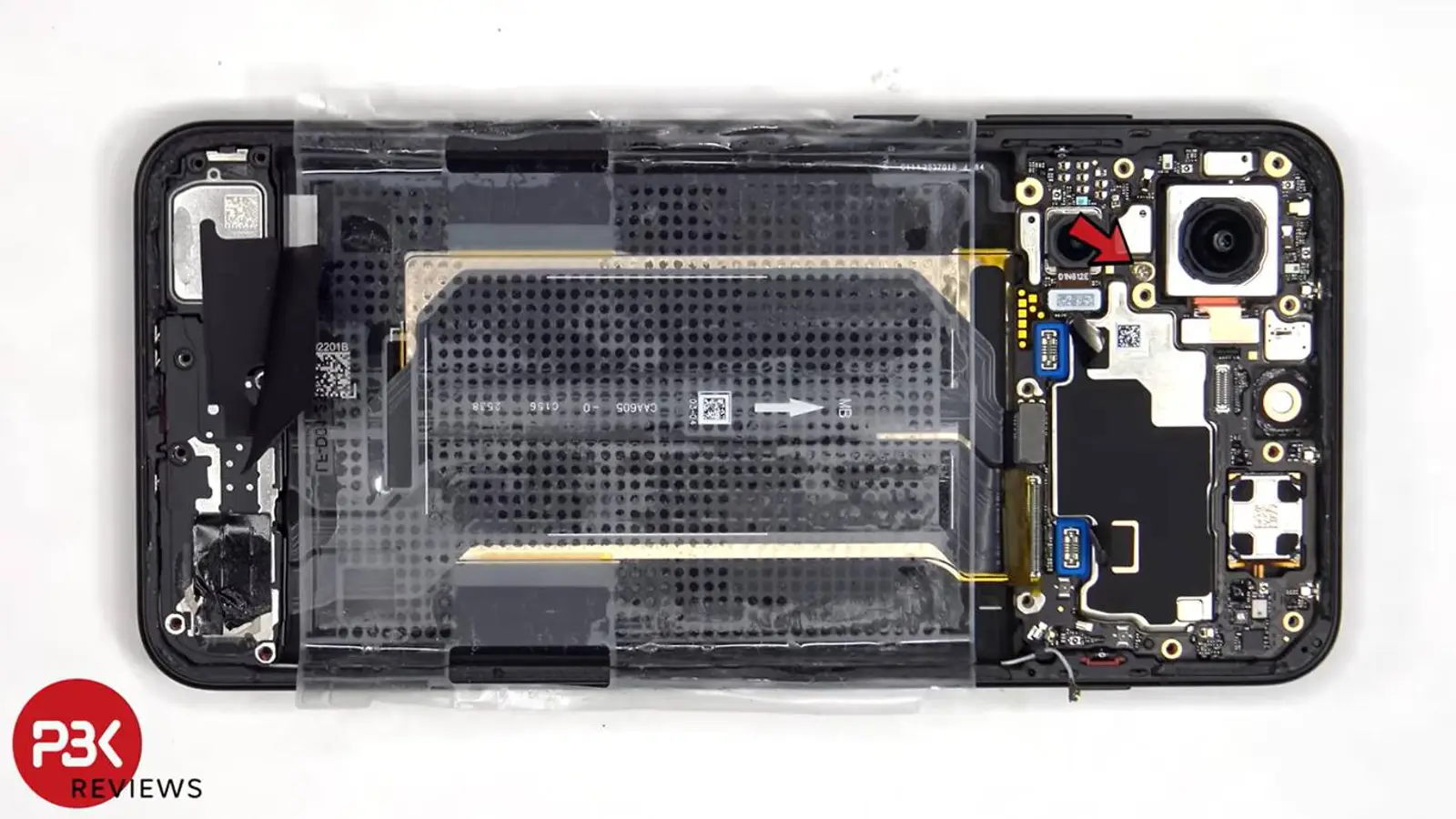 De batterij‑flexkabels liggen onder grafietfolie en koperband, maar OnePlus voorziet handige treklipjes langs de zijkanten van de cel, wat het uitnemen merkbaar eenvoudiger maakt. Na het loskoppelen van enkele flexkabels komt de 32‑megapixel selfiecamera zo los, en het moederbord wordt zelfs slechts door één schroef op zijn plek gehouden—een praktische keuze die sleutelwerk scheelt.