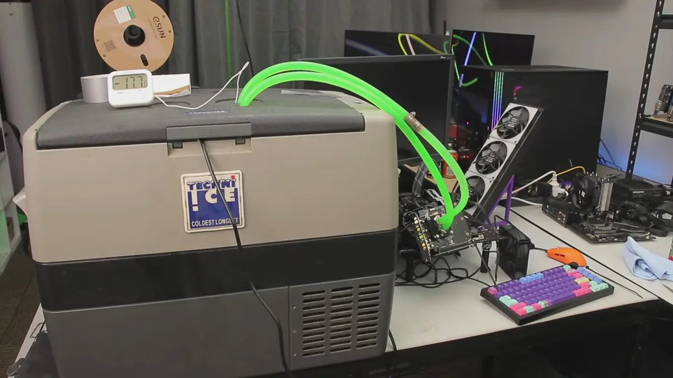 Экспериментатор под ником TrashBench вновь проверил пределы бюджетного железа и на этот раз подключил видеокарту Gigabyte RTX 5050 к переносному холодильнику Techni-Ice, превратив его в импровизированную экстремальную систему охлаждения. Он шунтировал карту, сняв заводские лимиты мощности, и направил охлаждающий контур с гликолевой смесью прямо в морозильную камеру, что позволило GPU работать при температурах от —12°C до 15°C.
